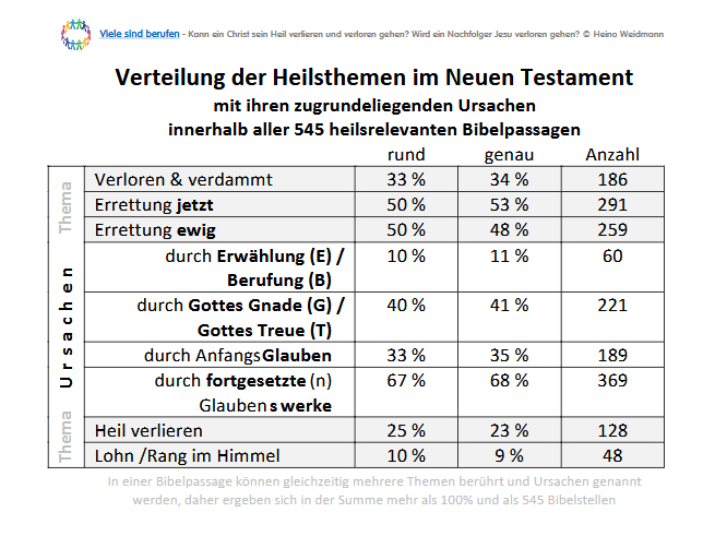 Etwa 10 % der Bibelpassagen im NT in denen es um die Ewigkeit und unsere jetzige oder ewige Errettung geht, stellen einen Bezug zu Gottes Erwählung (57%) und Berufung (43%) her.
